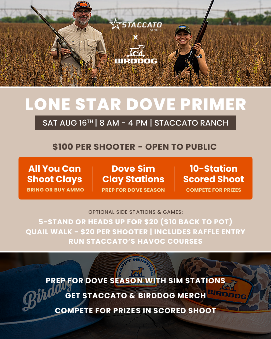 Get ready for Dove Season with Staccato Ranch & Birddog. Prepare for the season with sim stations, get Staccato & Birddog merchandise, and compete to win prizes. Open to the public!
